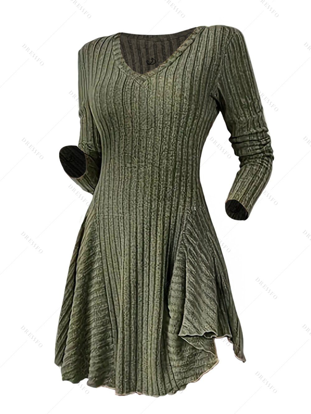Robe texturée de couleur unie, mini-robe à col en V et manches longues - Vert Armée XL | US 10