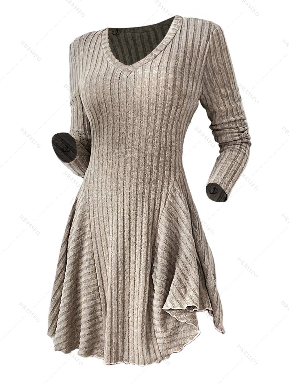 Robe texturée de couleur unie, mini-robe à col en V et manches longues - café lumière XXL | US 12