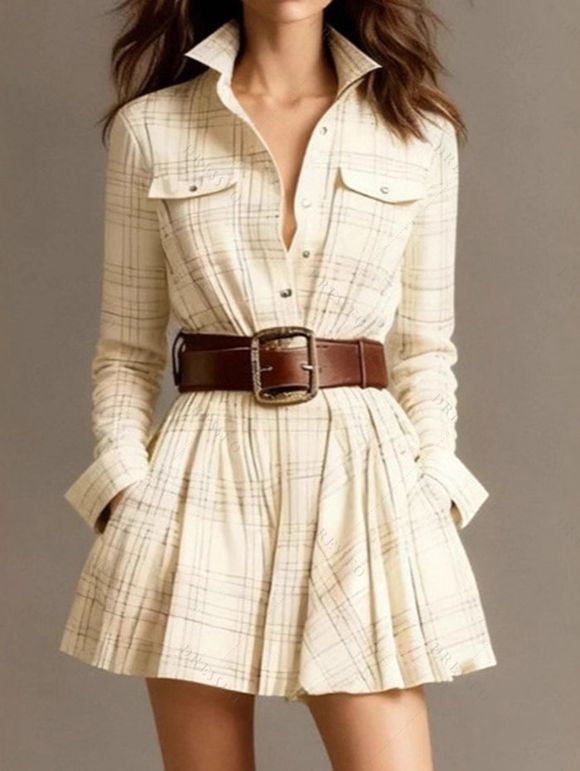 Robe vintage à carreaux, boutonnée sur le devant, poche, manches longues, ceinture