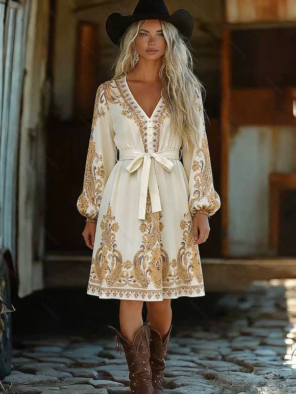 Robe vintage ethnique à imprimé cachemire, lacée, manches lanternes - Beige XL | US 10