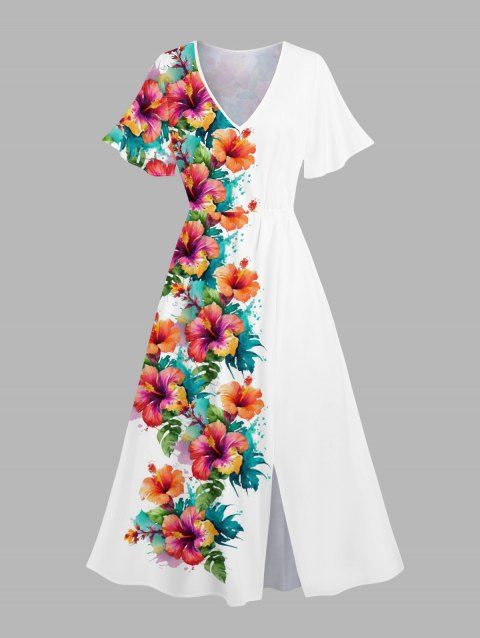 Robe de vacances à la plage Robe fendue à imprimé floral et feuilles d'hibiscus