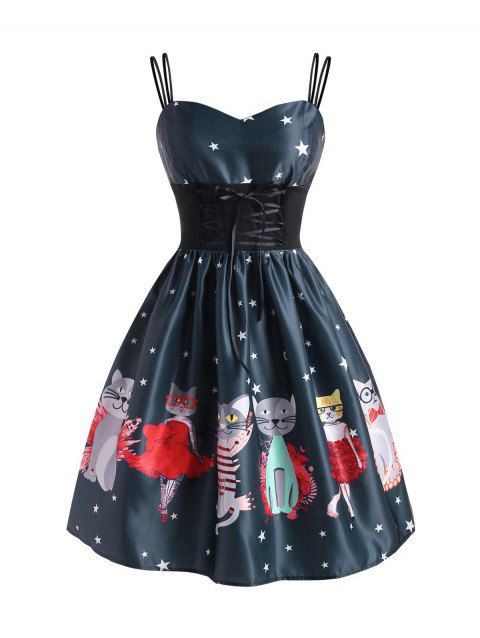 Robe D'Eté Ligne A Chat Dessin Animé Imprimé à Taille Haute sans Manches à Bretelle Fine
