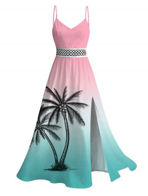 Vacation Dress for Beach Ombre Coconut Tree Print Lace Hollow Out Slit Dress