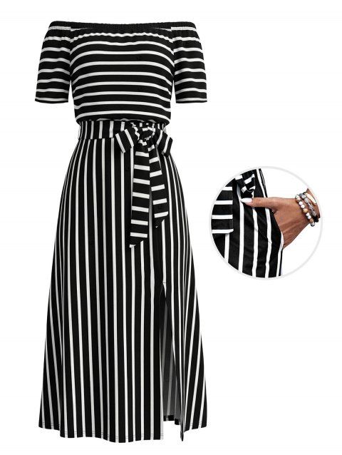 Vacation T-shirt Dress Striped Print Off the Shoulder Pocket Slit Belt Casual Dress