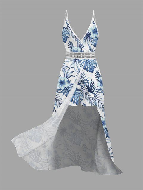 Hawaii Vacation Dress Retro Sketch Style Tropical Blossom Leaf Pattern Lace Hollow Out Slit Dress