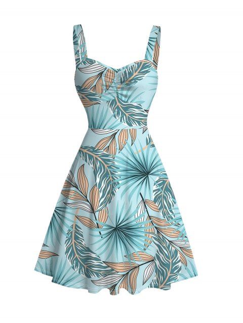 Robe de vacances à motif de feuilles, buste froncé, col en cœur, mini robe hawaïenne trapèze
