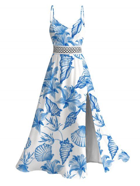 Hawaiian Dress Tropical Flower Leaf Print Lace Hollow Out Slit Spaghetti Strap Dress