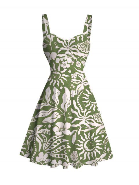 Hawaiian Vacation Dress Vintage Tropical Palm Tree Hibiscus Floral Print Spaghetti Strap Mini Dress