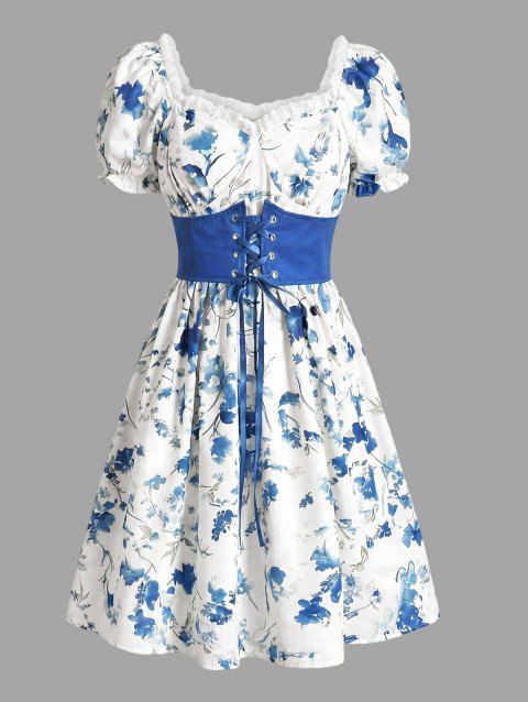 Mini Robe Décontractée à Imprimé Feuille Marguerite à Taille Haute en Blocs de Couleurs à Lacets