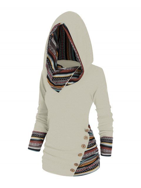 Robe à Capuche Tricotée Boutonnée en Blocs de Couleurs Ourlet Haut Bas à Manches Evasées