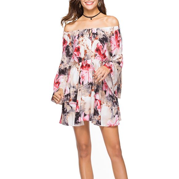 Slash Neck Fashion imprimé élastique manches taille évasée manches au-dessus du genou - Rose 2XL