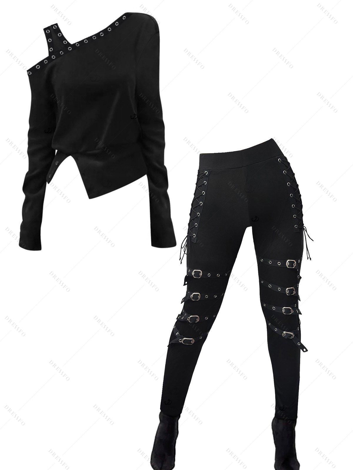Solid Color Women Outfit Skew Neck Slit Top and Grommet Leggings Set - Noir S | US 4
