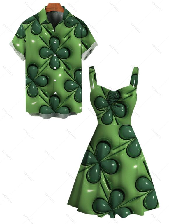 St.Patrick's Day Couple Outfit 3D Four-Leaf Clover Pattern Ruched Bust Dress and Shirt Set