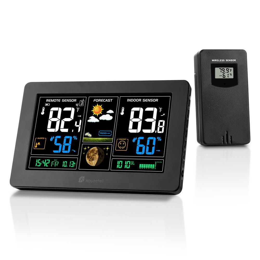 Prévisions météo et humidité précises et précises avec valeurs min / max record, format 12/24 heures, double réveil (option snooze), date et calendrier. Alertes de température intérieure et extérieure, flèche de tendance, réception et indicateurs de batterie faible. 12 icônes de phases de lune et pression barométrique avec historique de pression barométrique. Indicateur d'état du niveau de confort. Fonctions tout-en-un pour en faire un outil polyvalent et nécessaire pour votre maison.