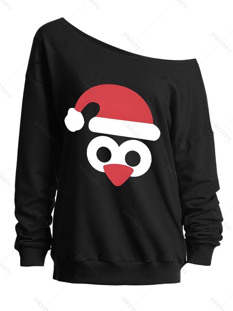 Sweat-shirt de Noël imprimé avec bonnet de Noël et col asymétrique - Noir XXL | US 14