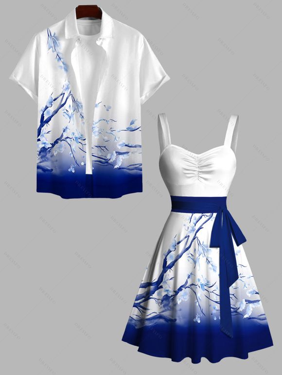 Sweetheart Neck Plum Blossom Ombre Print Belt Dress and Roll Up Sleeve Shirt Drawstring Vocation Outfit - Bleu S | US 4