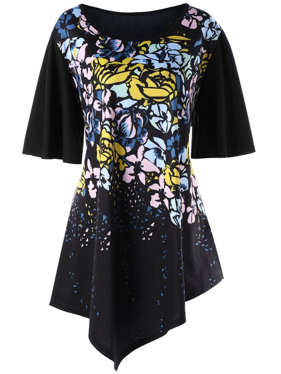T-Shirt Asymétrique Motif Floral Grande-Taille - Noir XL