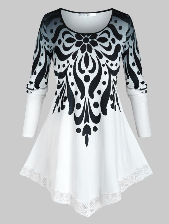 T-shirt Tribal Imprimé en Couleur Ombrée de Grande Taille à Ourlet en Dentelle