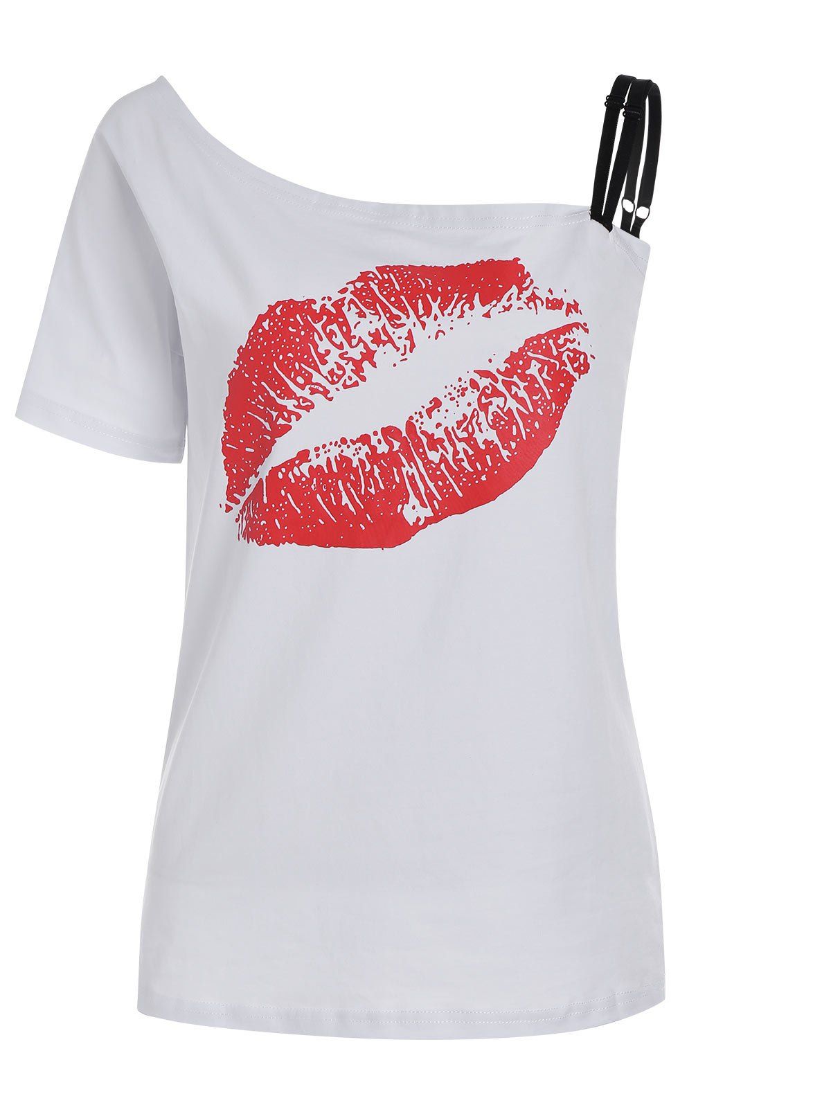 Ce tee décontracté avec collier oblique avec imprimé à lèvres sexy. Il convient à la vie quotidienne d'été.