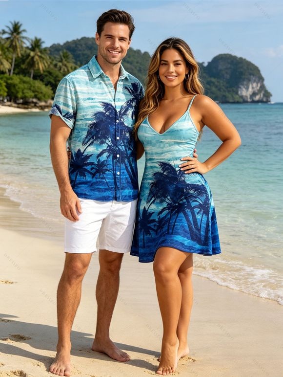 Tie Dye Coconut Tree Print V Neck Hawaii Vacation Mini Dress And Short Sleeve Shirt Matching Outfit - Bleu clair S | US 4