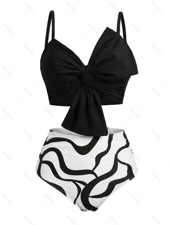 Two Piece Beach Tankini Swimsuit Twisted Bowknot Spaghetti Strap Padded Top and Colored Leaf Pattern Ruched Tummy Control Briefs Vacation Swimwear - Noir XL | US 10