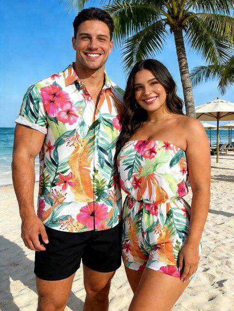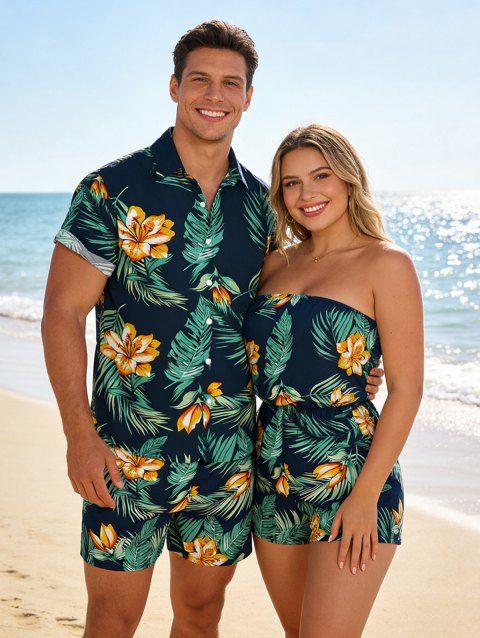 Vacation Couple Outfit Flower Tropical Leaf Print Off the Shoulder Romper and Shirt Set