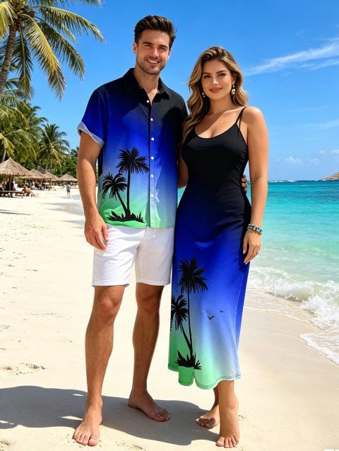 Beach Couple Outfit Coconut Tree Print Ombre Spaghetti Strap Dress and Shirt Set