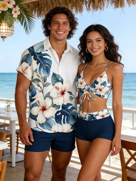 Vacation Couple Outfit Tropical Hibiscus Floral Leaf Print Cinched Boyshorts Swimsuit and Shirt Set