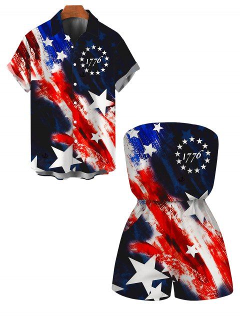 Patriotic Couple Outfit Starburst American Flag Print Lace Hollow Out Slit Dress and Shirt Set