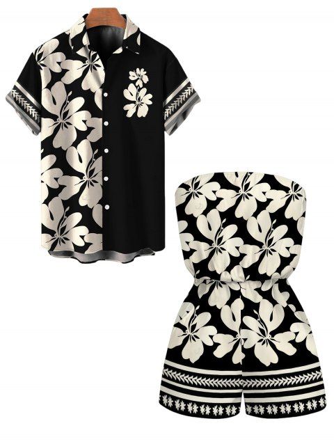 Hawaii Couple Outfit Tribal Hibiscus Floral Print Bowknot Off the Shoulder Jumpsuit and Shirt Set