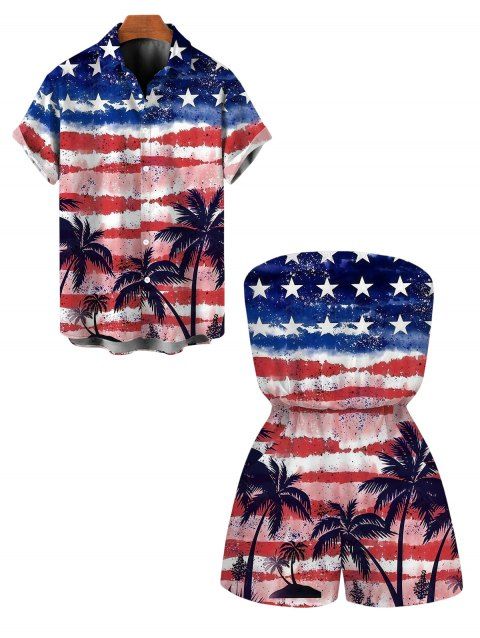 Patriotic Couple Outfit American Flag Palm Tree Print Lace Hollow Out Slit Dress and Shirt Set