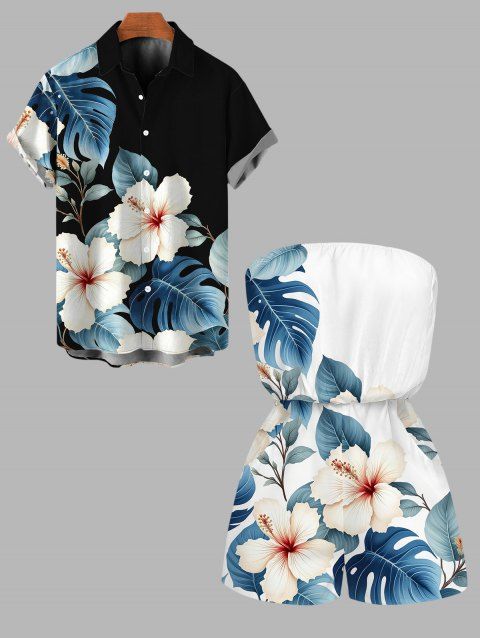 Hawaii Vacation Couple Outfit Hibiscus Floral Palm Leaf Pattern Ruched Bust Mini Dress and Shirt Set