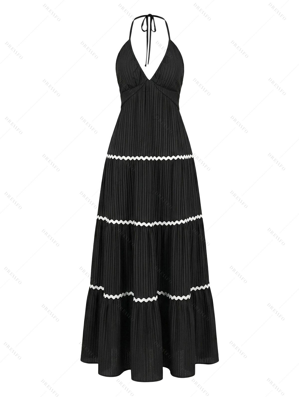 Vacation Colorblock Dress V Neck Zig Zag Halter Open Back Tiered Cake Dress - Noir XL | US 12