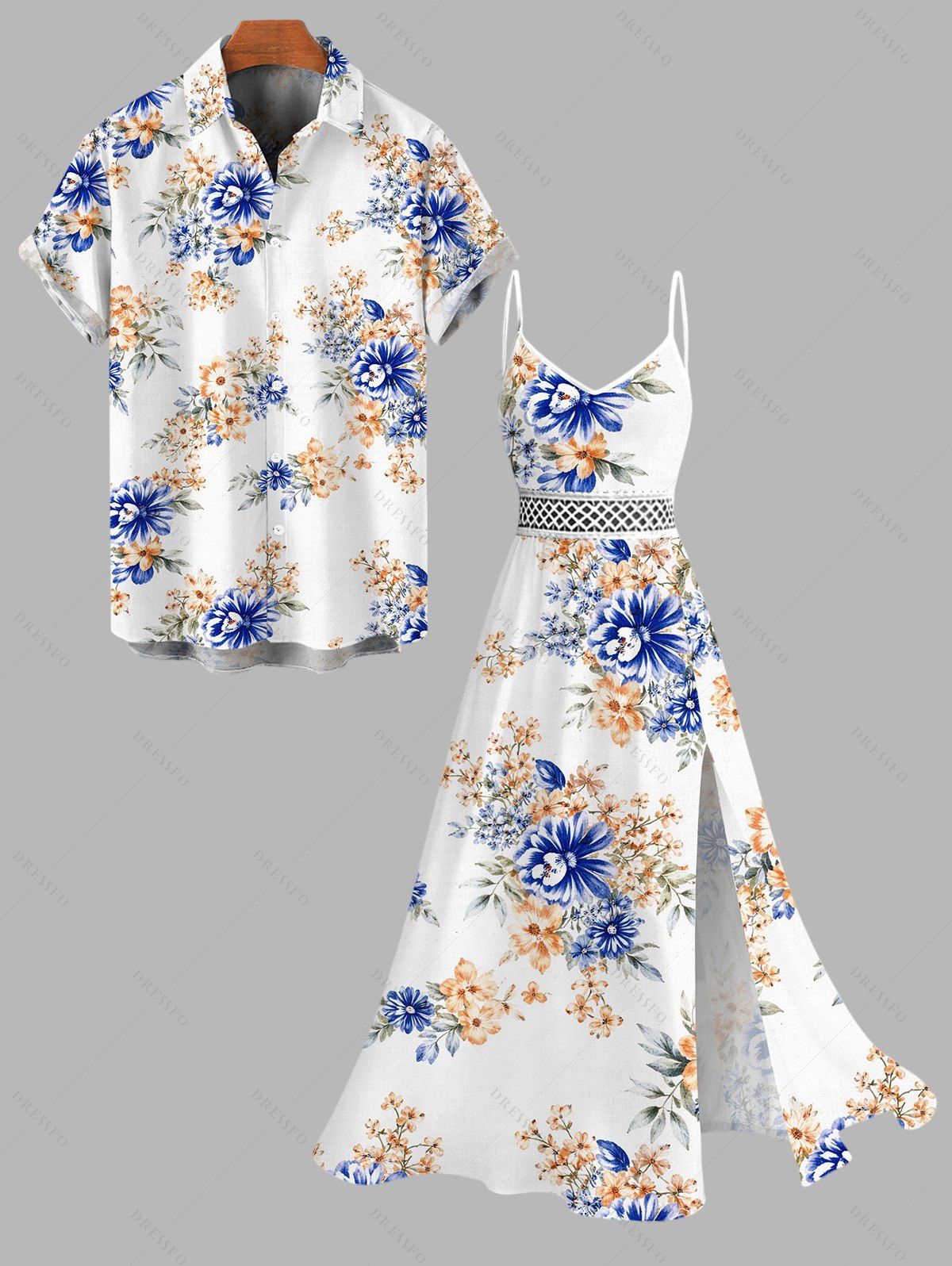 Vacation Couple Outfit Apricot Floral Print Lace Hollow Out Slit Dress and Shirt Set - Bleu S | US 4