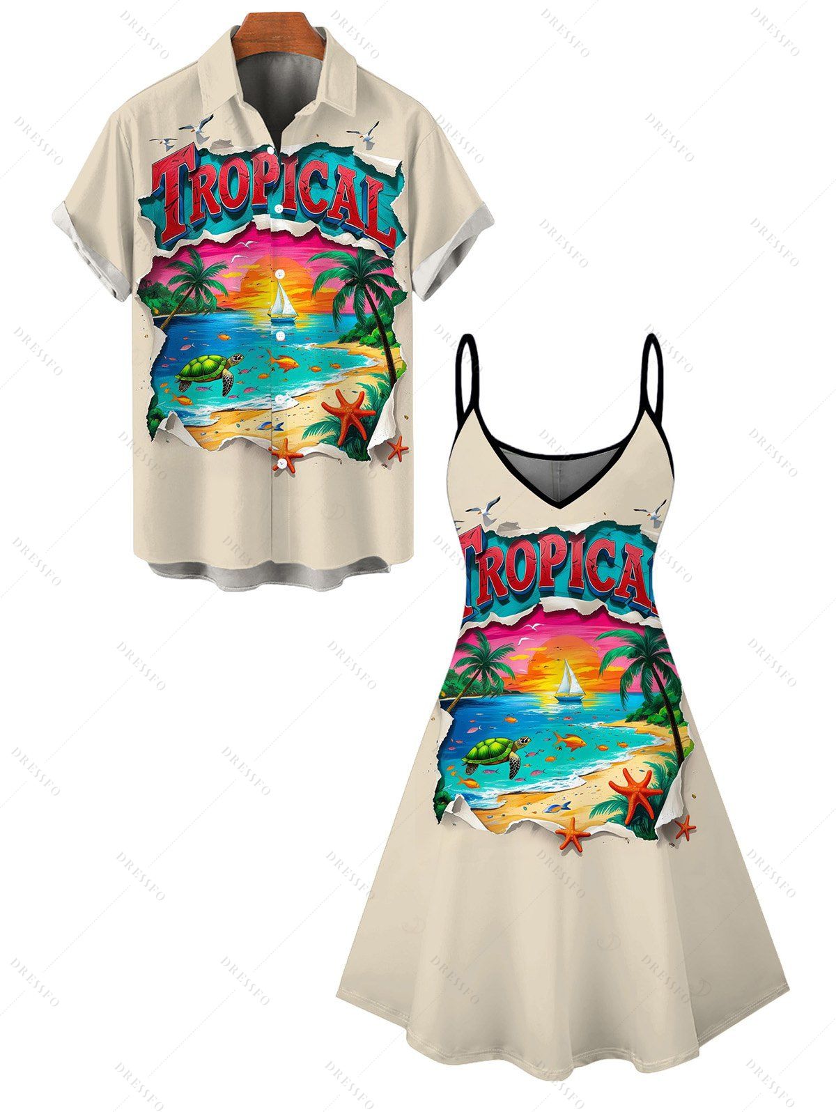 Vacation Couple Outfit Beach Landscape Letter Print Dress and Shirt Set - Abricot S | US 4