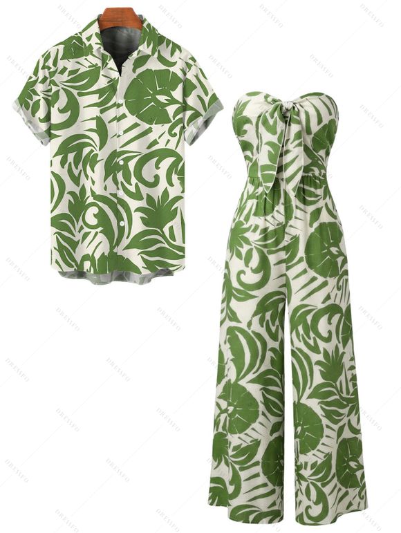 Vacation Couple Outfit Botanical Leaf Print Bowknot Off the Shoulder Jumpsuit and Shirt Set - Vert S | US 4