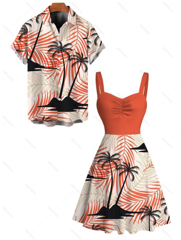 Vacation Couple Outfit Coconut Tree Tropical Leaf Print Ruched Dress and Shirt Set - Orange S | US 4