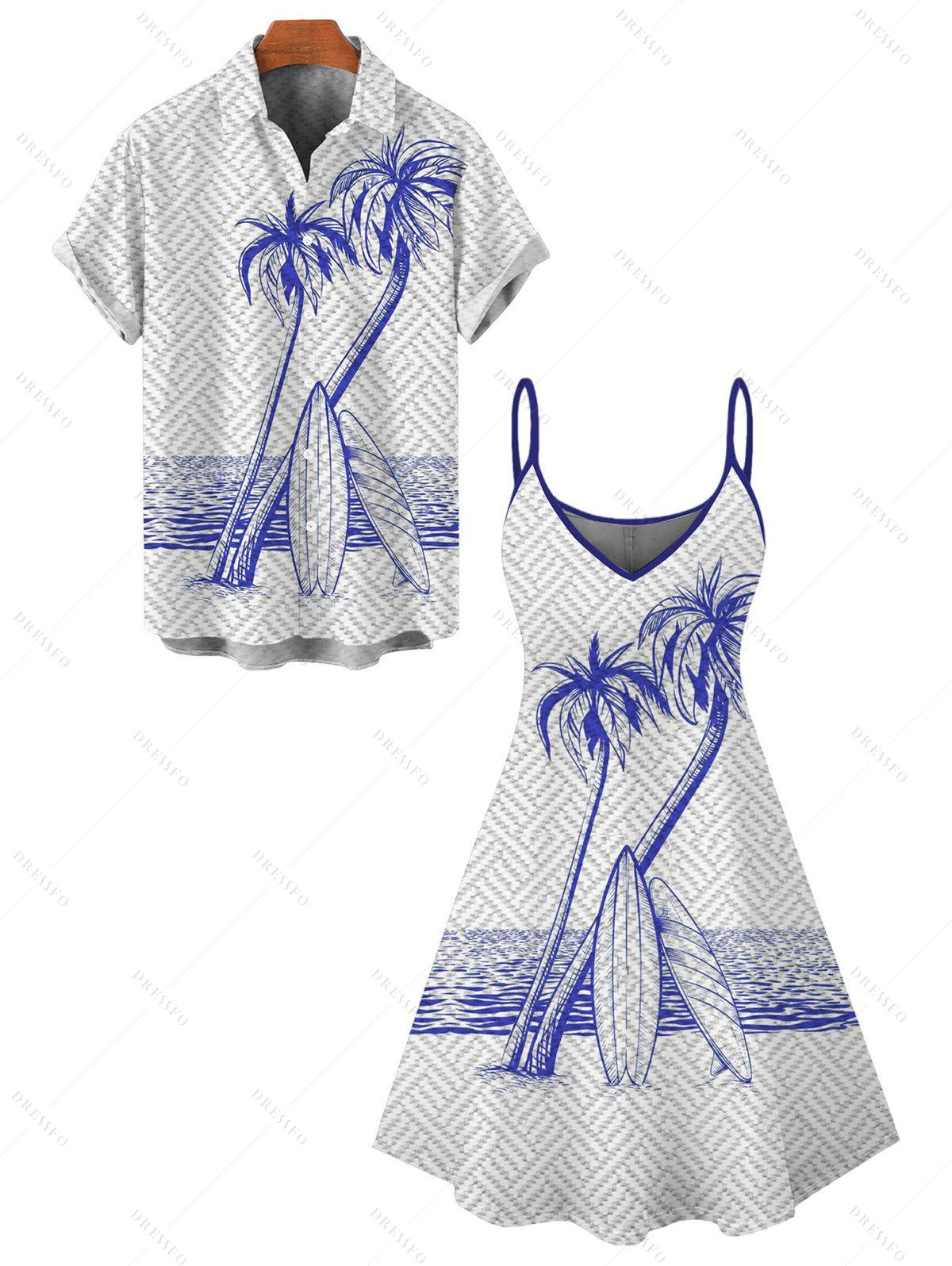 Vacation Couple Outfit Coconut Tree Surfing Board Geometric Print Dress and Shirt Set - Bleu Marine S | US 4