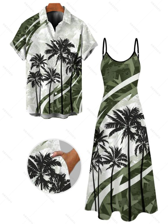 Vacation Couple Outfit Coconut Tree Pattern Colorblock Long Dress and Shirt Set - Vert Armée S | US 4