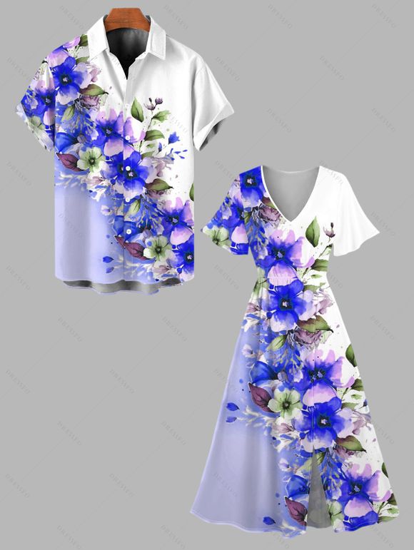 Vacation Couple Outfit Colorblock Flower Leaf Print Slit Dress and Shirt Set - Bleu Ciel S | US 4