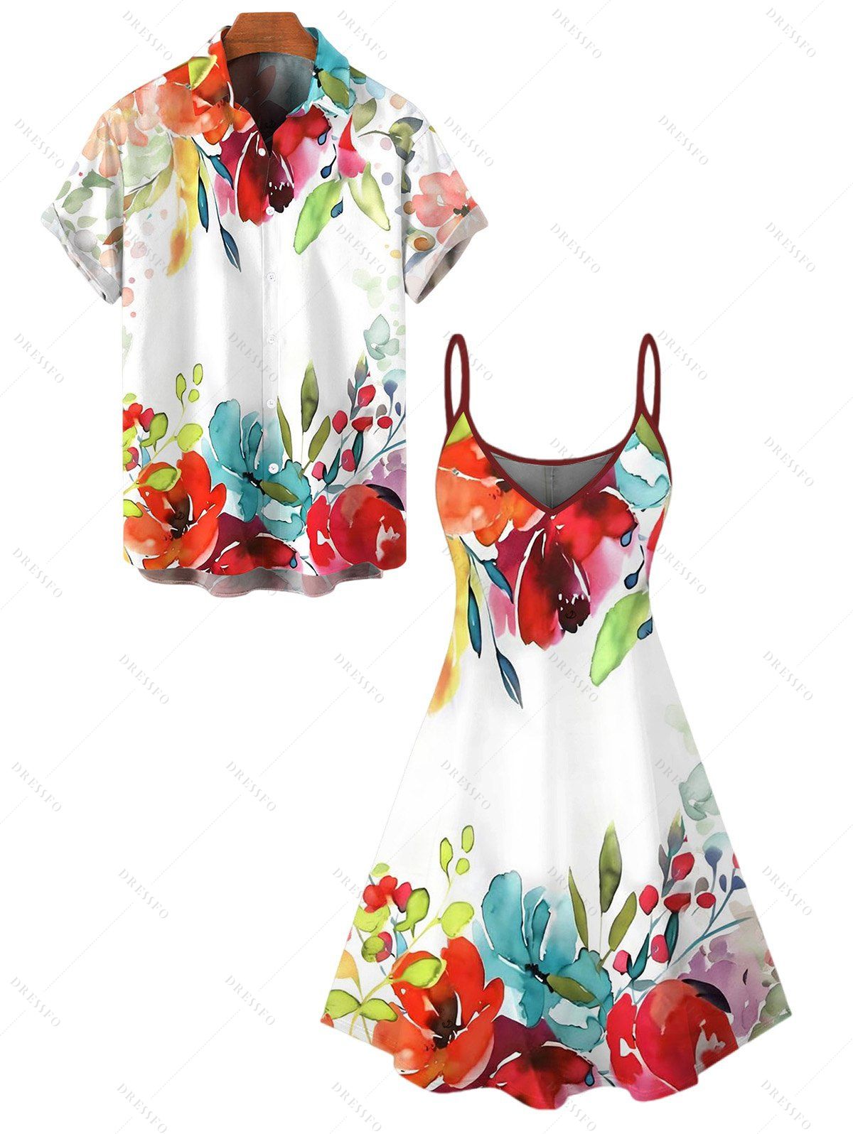 Vacation Couple Outfit Colored Flower Leaf Pattern Spaghetti Strap Dress and Shirt Set - Rouge S | US 4