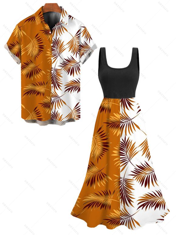 Vacation Couple Outfit Contrast Color Leaf Print Dress and Shirt Set