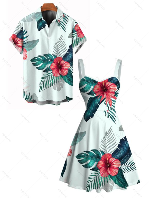 Vacation Couple Outfit Flower Leaf Print Ruched Bust Dress and Shirt Set