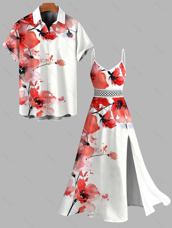Vacation Couple Outfit Watercolor Flower Print Hollow Out Slit Dress and Shirt Set - Blanc S | US 4