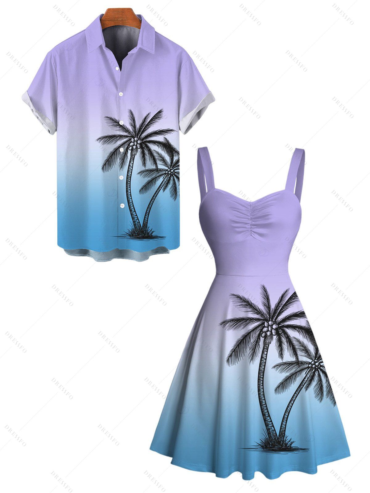 Vacation Couple Outfit for Beach Ombre Coconut Tree Print Mini Dress and Shirt Matching Set - violet lilas S | US 4