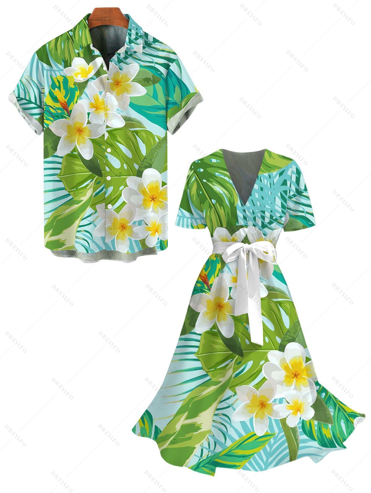 Vacation Couple Outfit Frangipani Tropical Leaf Print Belt Dress and Shirt Set - Vert clair S | US 4