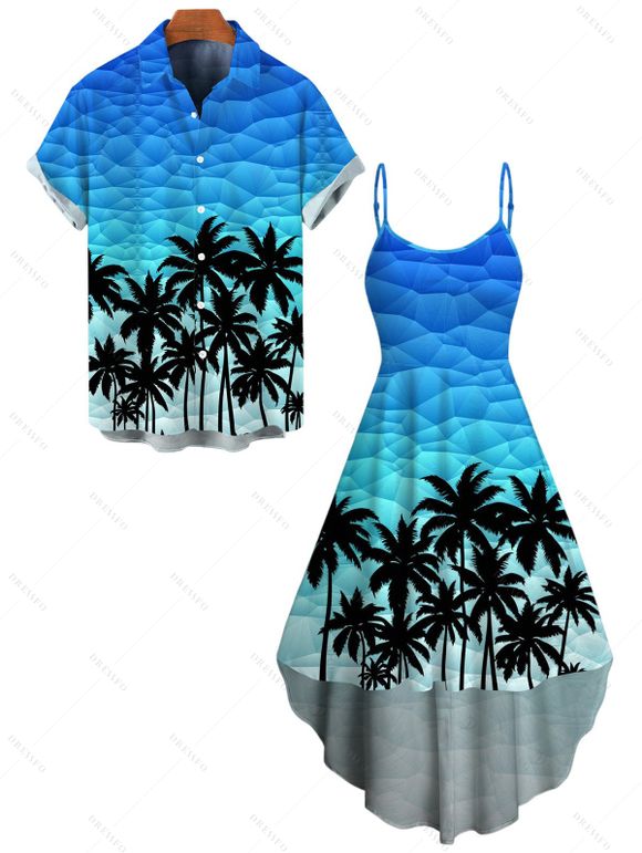 Vacation Couple Outfit Geometric Coconut Tree Print High Low Dress and Shirt Set