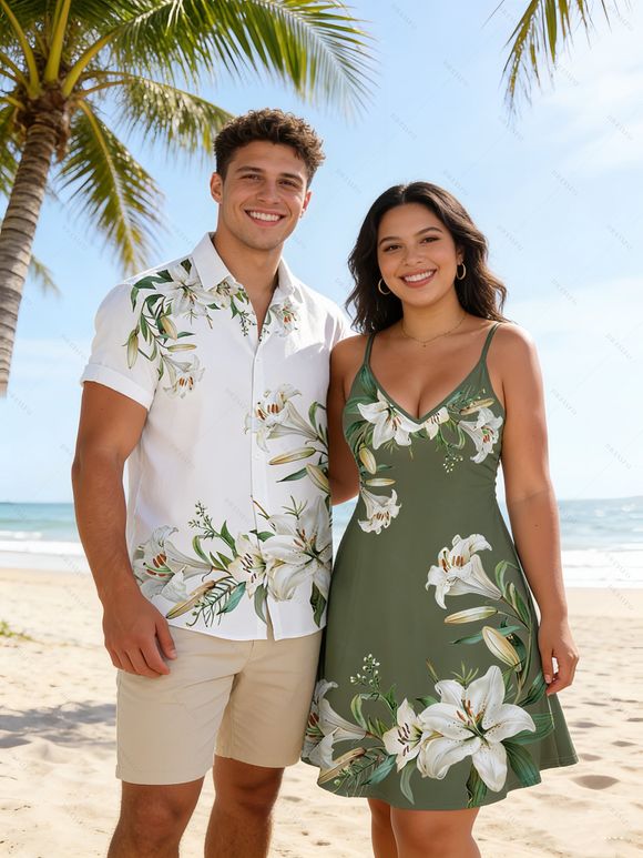 Vacation Couple Outfit Lily Floral Leaf Print Spaghetti Strap Dress and Shirt Set - Vert Armée S | US 4