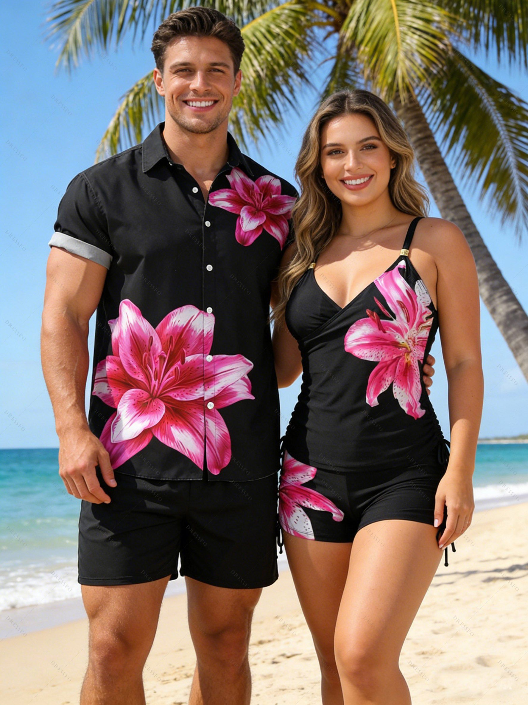 Vacation Couple Outfit Lily Floral Print Cinched Boyshorts Swimsuit and Shirt Shorts Set