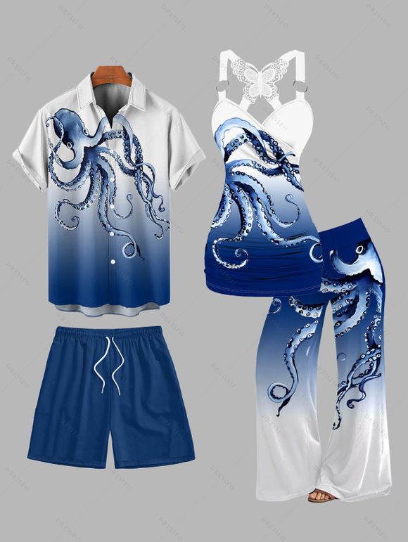 Vacation Couple Outfit Octopus Foot Print Tank Top Wide Leg Pants and Button Up Shirt Drawstrings Shorts Beach Matching Outfit - Bleu profond S | US 4 HOT Vacation Couple Outfit Octopus Foot Print Tank Top Wide Leg Pants and Button Up Shirt Drawstrings Shorts Beach Matching Outfit - Bleu profond S | US 4 HOT